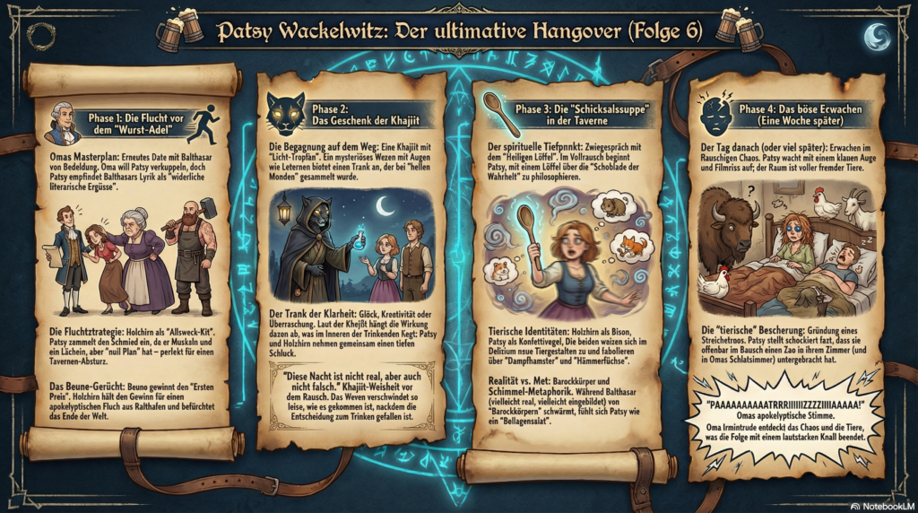 Wenn man morgens von Omas „liebreizender Kriegshornstimme“ geweckt wird und realisiert, dass ein weiteres Rendezvous mit dem sterbenslangweiligen Balthasar von Bodeldung ansteht, bleibt nur der taktische Rückzug. Der Plan war simpel, fast schon genial in seiner Einfachheit: Holzhirn einsammeln, ab in die Taverne, Kopf aus. Ein kleiner Kurzurlaub von der Realität.