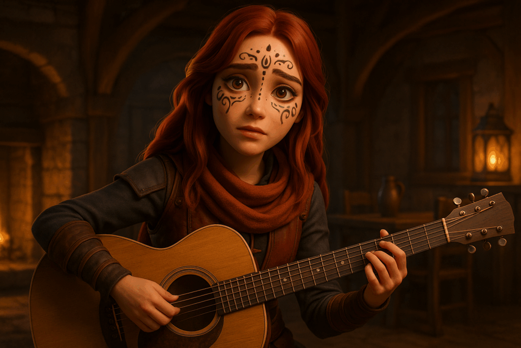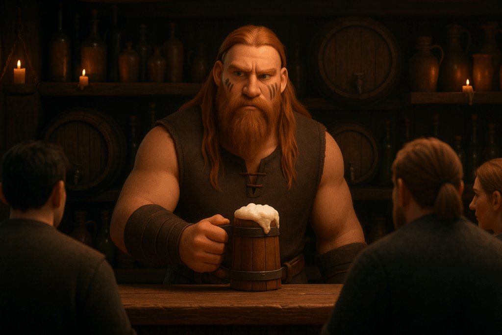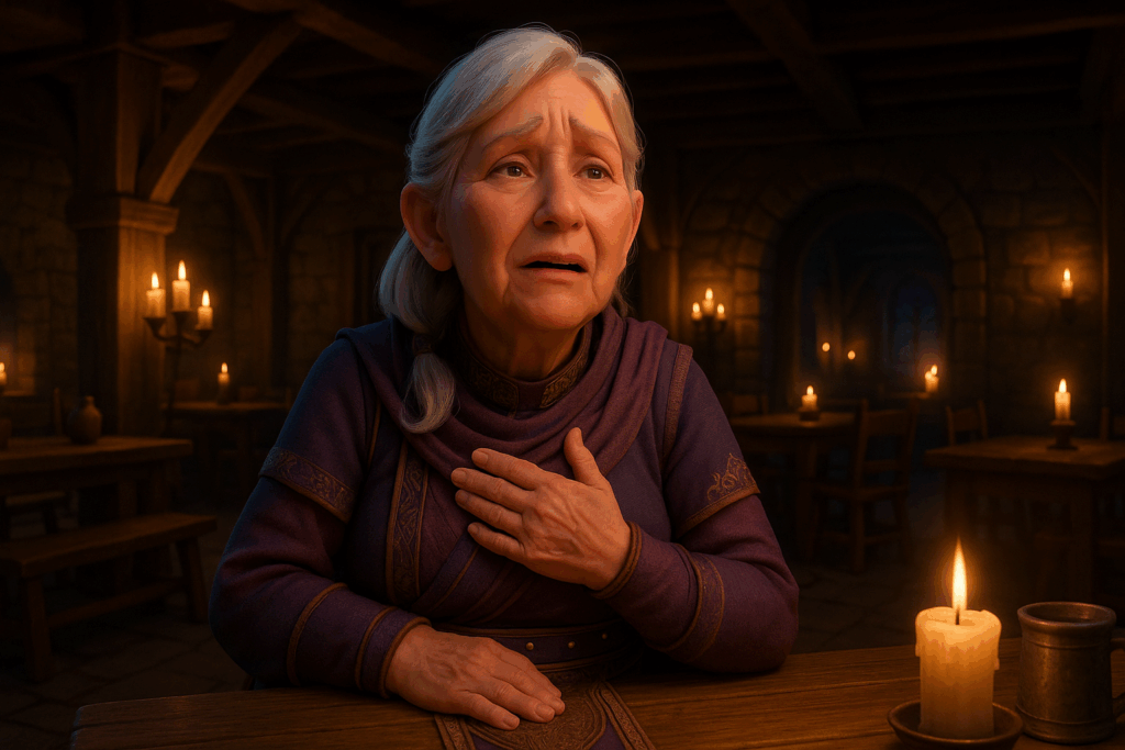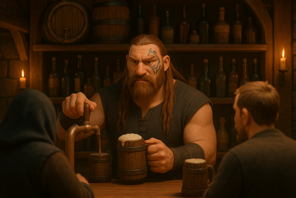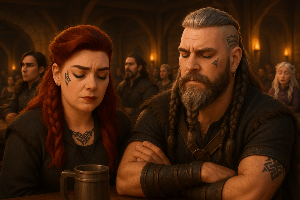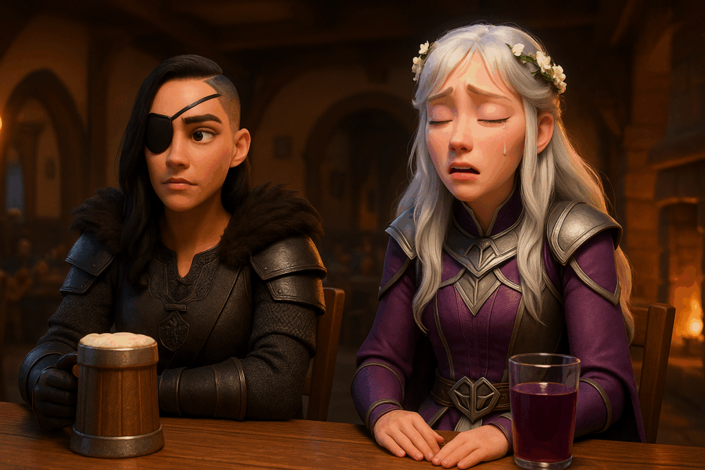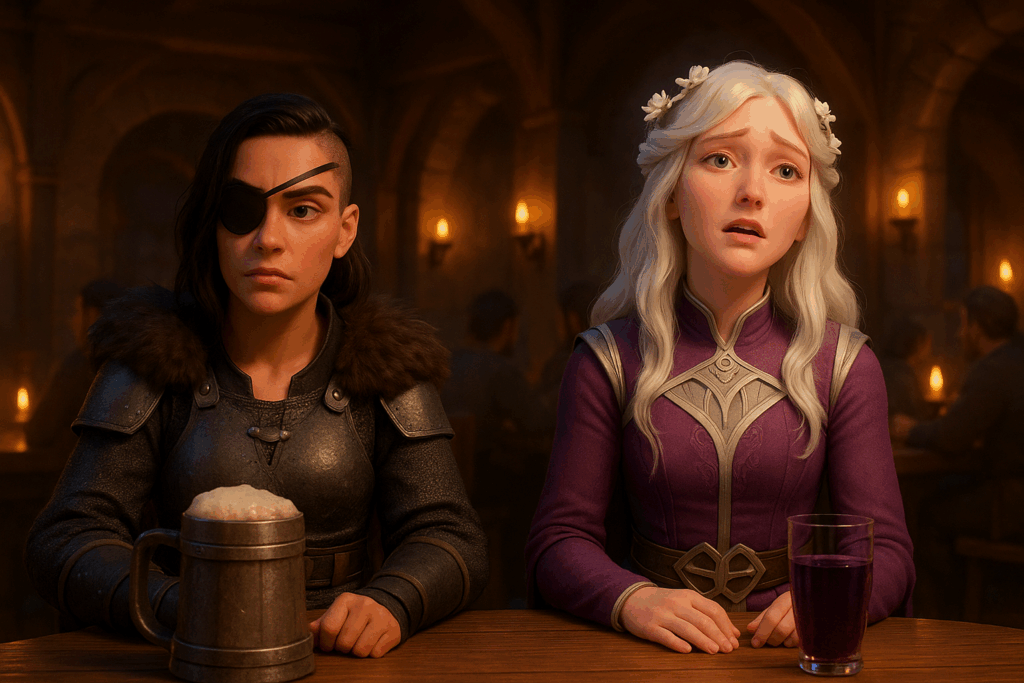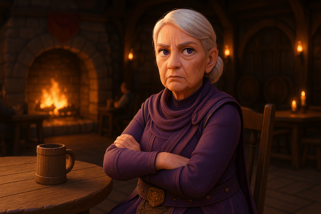 Mein Setting: Eine Taverne im mittelalterlichen Stil. Dazu habe ich einige Charaktere aus meiner eigenen Fan-Serie hinzugefügt – unter anderem Patsy, die Oma, sowie den Barden aus The Elder Scrolls Online. Aus Herr der Ringe Online habe ich Skaldiv und Alenwen eingebaut. Alle anderen Charaktere wurden frei erstellt – bis auf zwei, aber auf die gehe ich nicht weiter ein. Nö und nö. 🙂